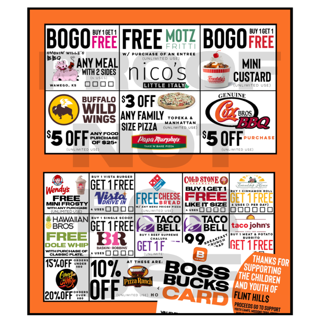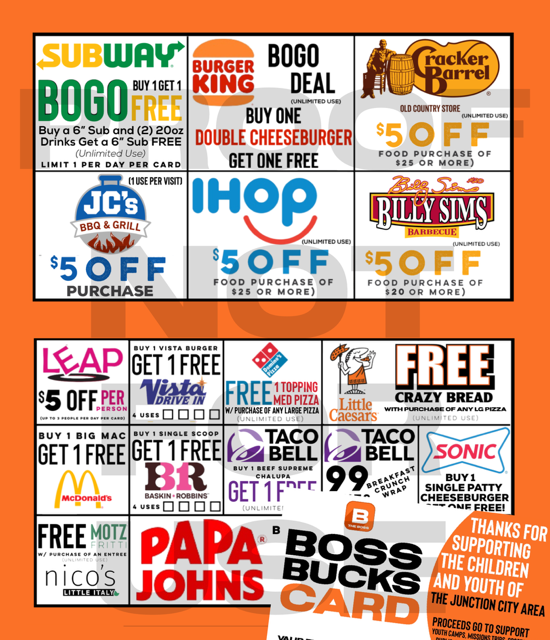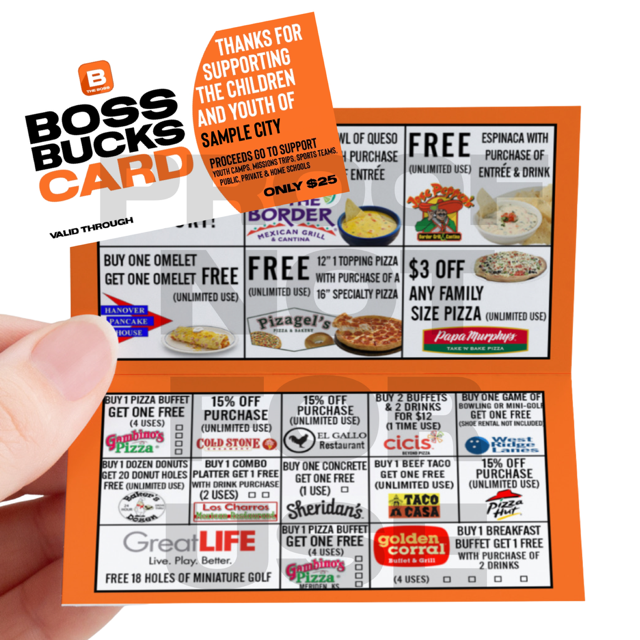 The Physical Boss Bucks Card is your gateway to exclusive discounts and deals at local restaurants and businesses. Carry this card in your wallet and present it at participating locations to unlock big savings while supporting youth!
